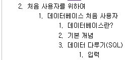 3. 동일 레벨의 목록/문서를 추가할때는 그냥 엔터키를 친 후 입력하면 되며, 현재 입력한 내용을 한단계 아래로 보낼때는 아래 그림중 오른쪽 그림을, 한단계 위로 보낼때는 왼쪽 그림을 클릭한다.
