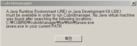 그러므로 CUBRID Manager Client 실행시 에러 중 그림1. 과 같이 'Java 경로'나 'Java 미설치'의 내용을 포함하는