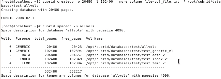cubrid createdb -p 20480 -l 102400 --more-vol-file vol_file.txt -F /opt/cubrid/databases/test
