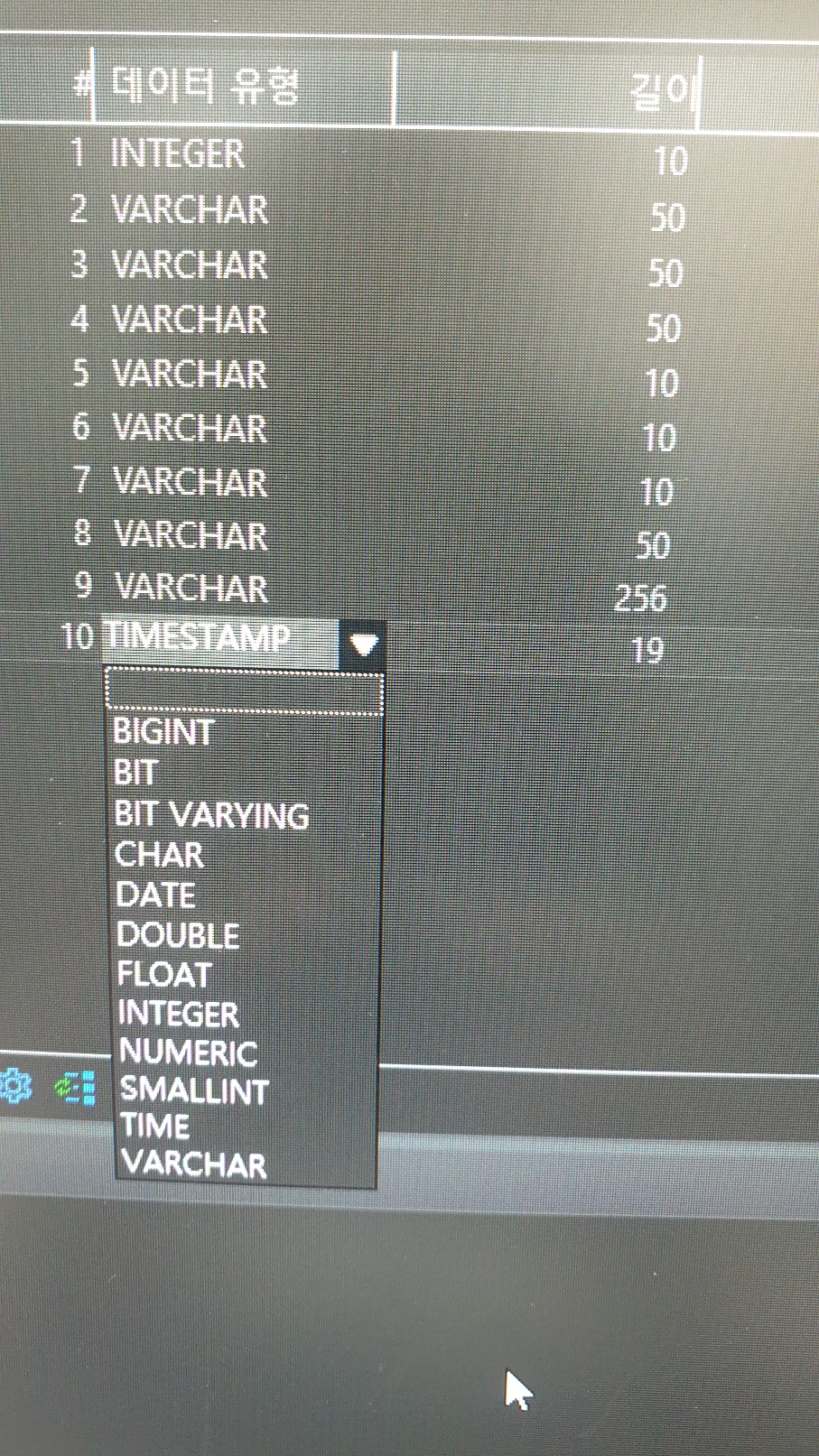 db에서도 기존에 TIMESTAMP가 있는 테이블의 컬럼에서 데이터유형을 드랍해보면 선택할수있는 항목에 TIMESTAMP 는 선택사항으로 보이지 않습니다.